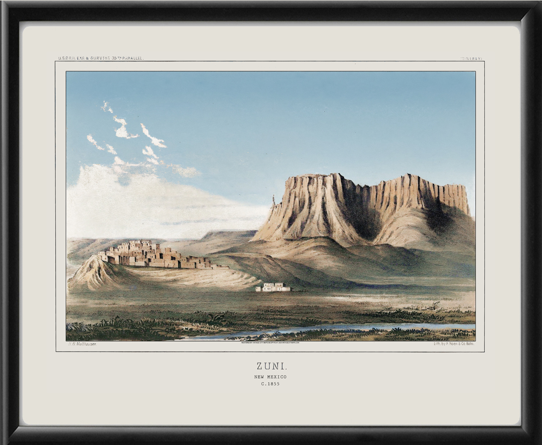 Restored panoramic view of the Zuni Pueblo in New Mexico, circa 1855 by H.B. Mollhausen.