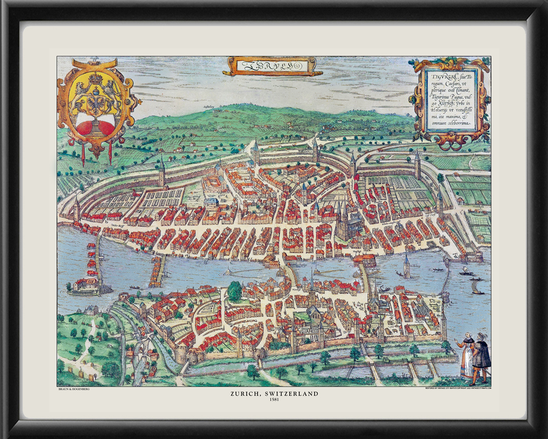 Restored bird’s eye view map of Zurich, Switzerland, 1581 by Georg Braun & Frans Hogenberg.